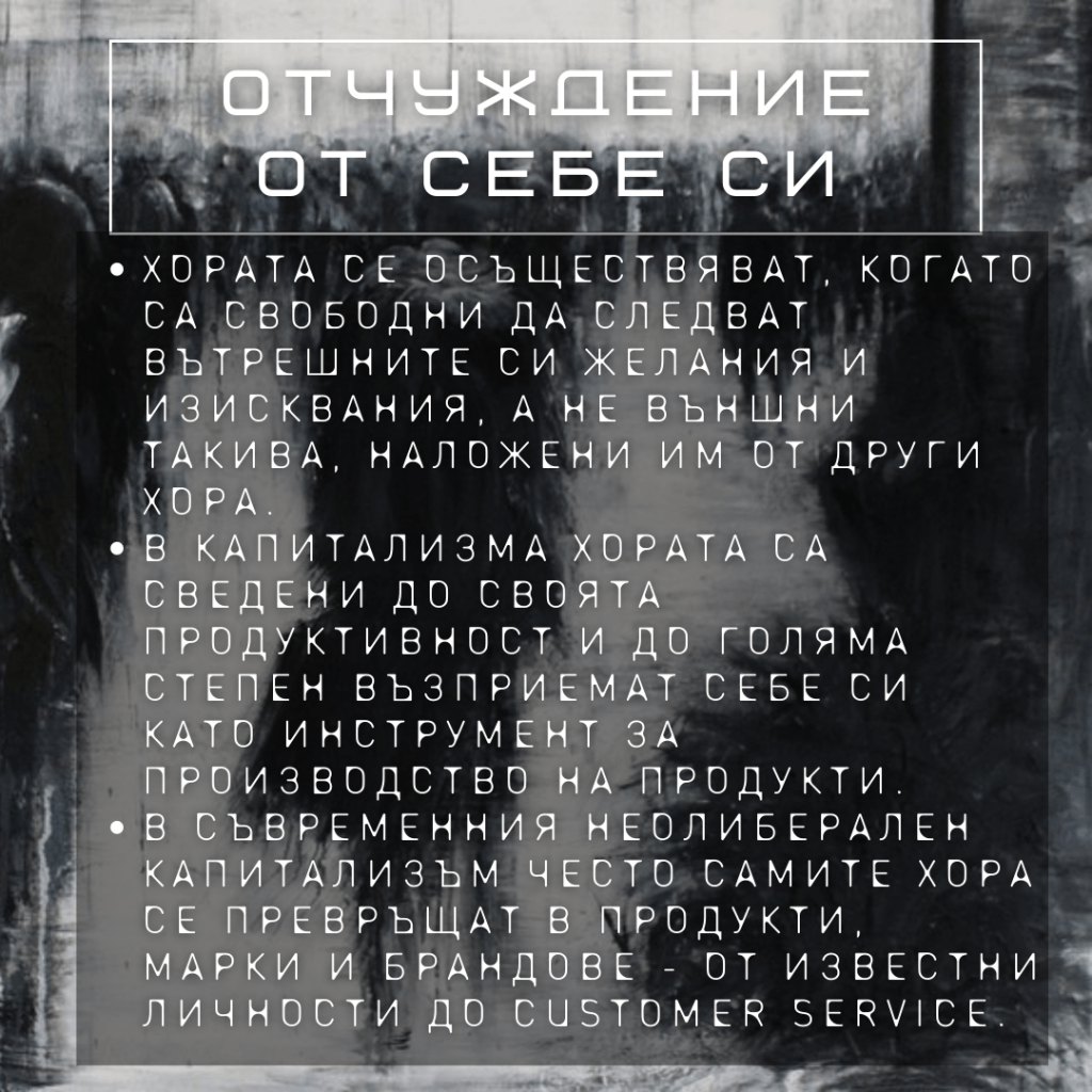 - в капитализма повечето хора не притежават труда си, продуктите му и средствата за производство – те принадлежат на компанията, за която работят. Тя прибира печалбата и определя какво и как се произвежда.