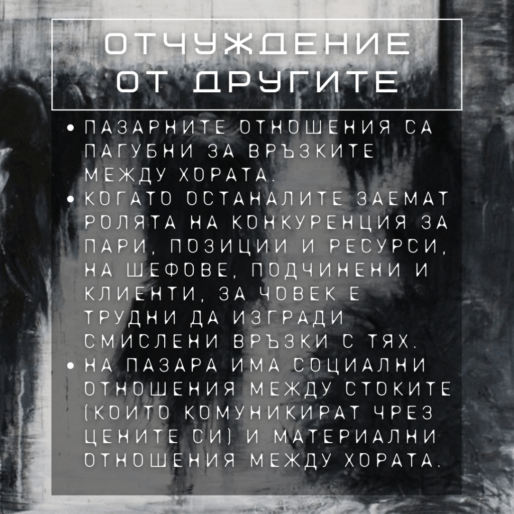 - На пазара има социални отношения между стоките, които комуникират чрез цените си, и материални отношения между хората.